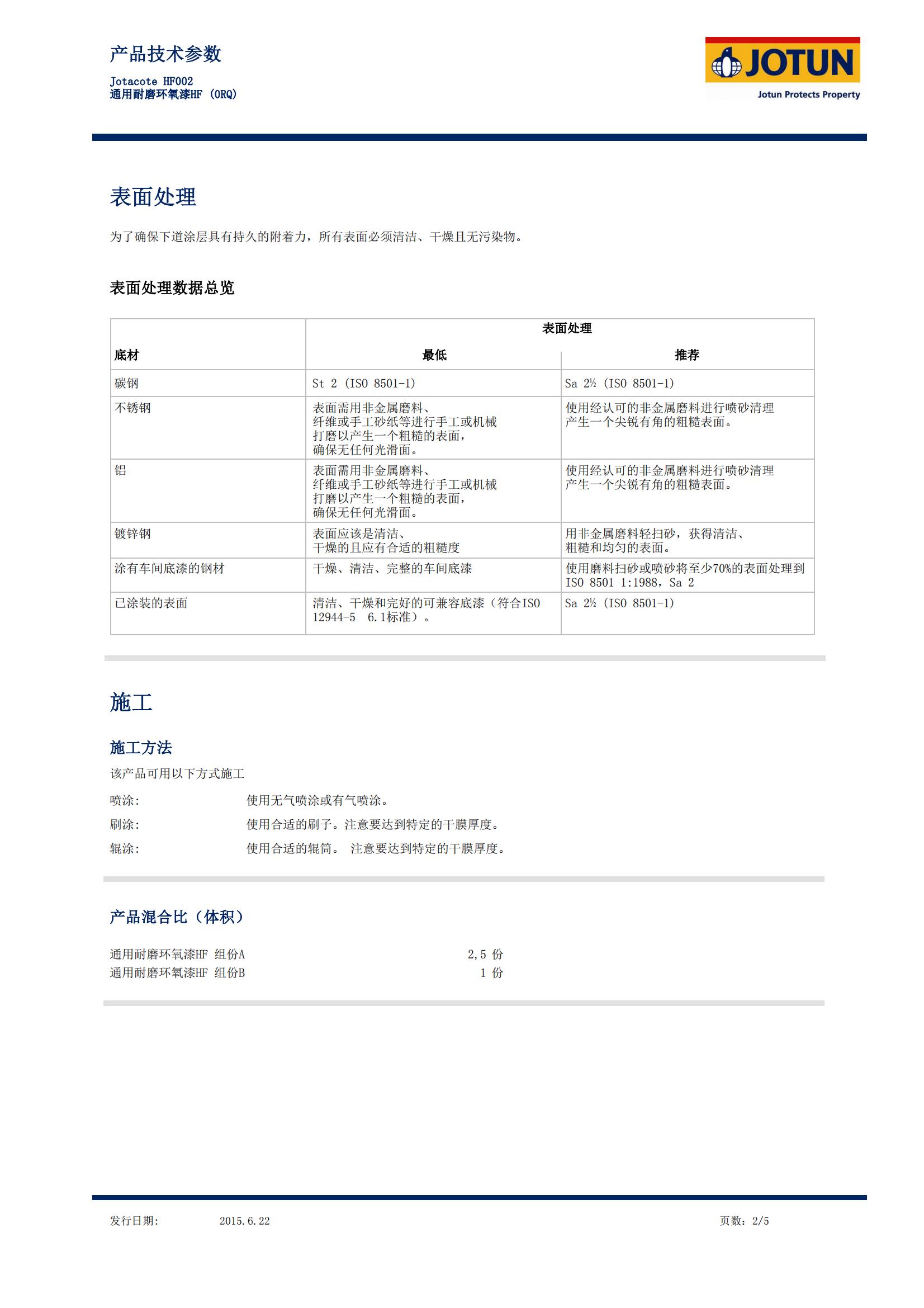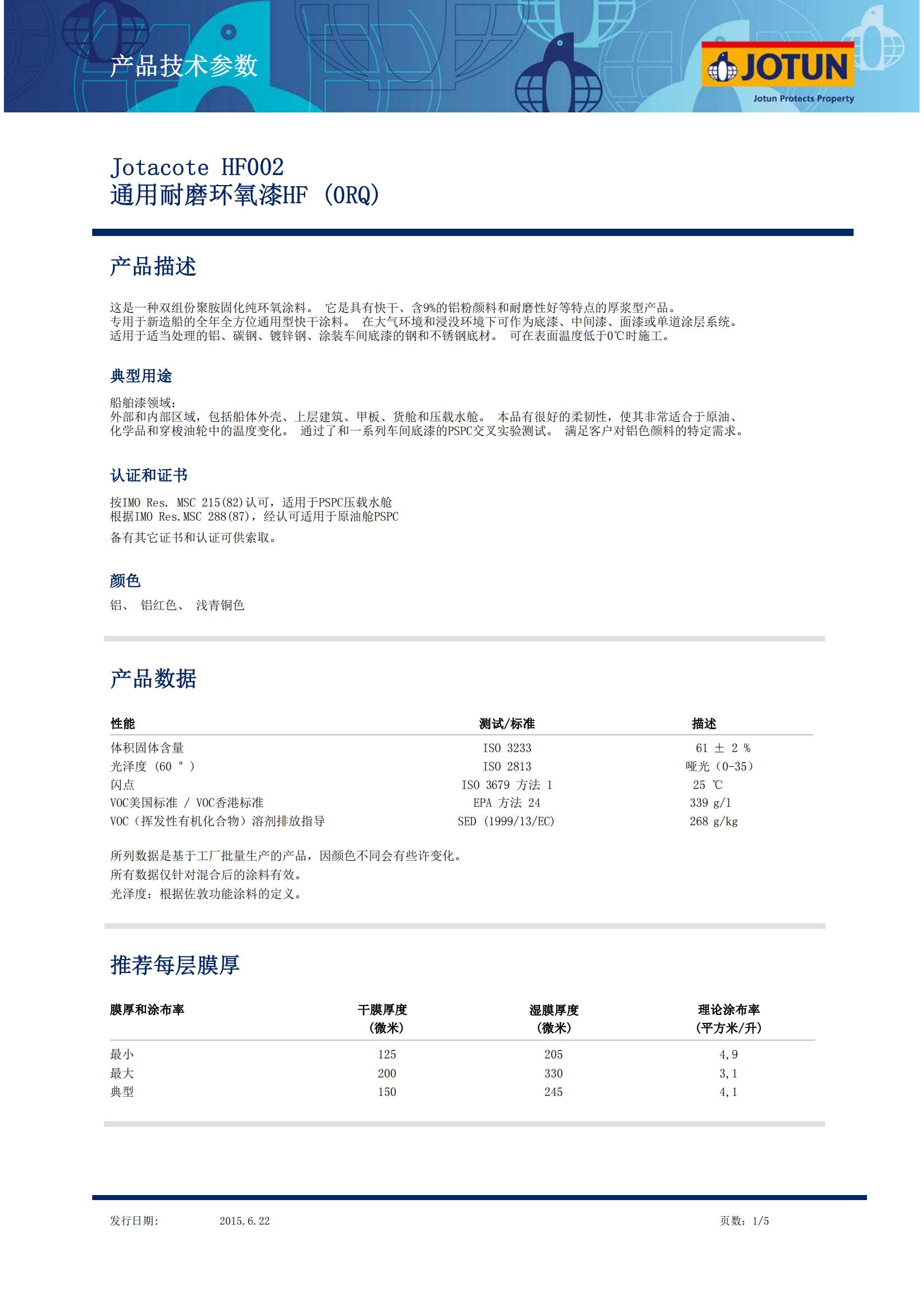 • Jotacote HF002 0RQ:這是一種雙組份聚胺固化純環(huán)氧涂料。 它是具有快干、含9%的鋁粉顏料和耐磨性好等特點的厚漿型產(chǎn)品。專用于新造船的全年全方位通用型快干涂料。 在大氣環(huán)境和浸沒環(huán)境下可作為底漆、中間漆、面漆或單道涂層系統(tǒng)。適用于適當處理的鋁、碳鋼、鍍鋅鋼、涂裝車間底漆的鋼和不銹鋼底材。 可在表面溫度低于0°C時施工。典型用途:外部和內(nèi)部區(qū)域,包括船體外殼、上層建筑、甲板、貨艙和壓載水艙。 本品有很好的柔韌性,使其非常適合于原油、化學品和穿梭油輪中的溫度變化。 通過了和一系列車間底漆的PSPC交叉實驗測試。 滿足客戶對鋁色顏料的特定需求